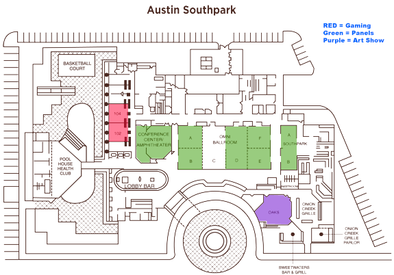 We will convene at the Omni Southpark Hotel, which is near the airport on the south side of Austin. Click the link below to reserve a room using the convention rate. If you reserve by phone, you should be able to tell them it is for ArmadilloCon and get the con rate. The cutoff date for getting ArmadilloCon room rate is Thursday, July 9. After the cutoff, the rooms will sell fast, so don't delay.